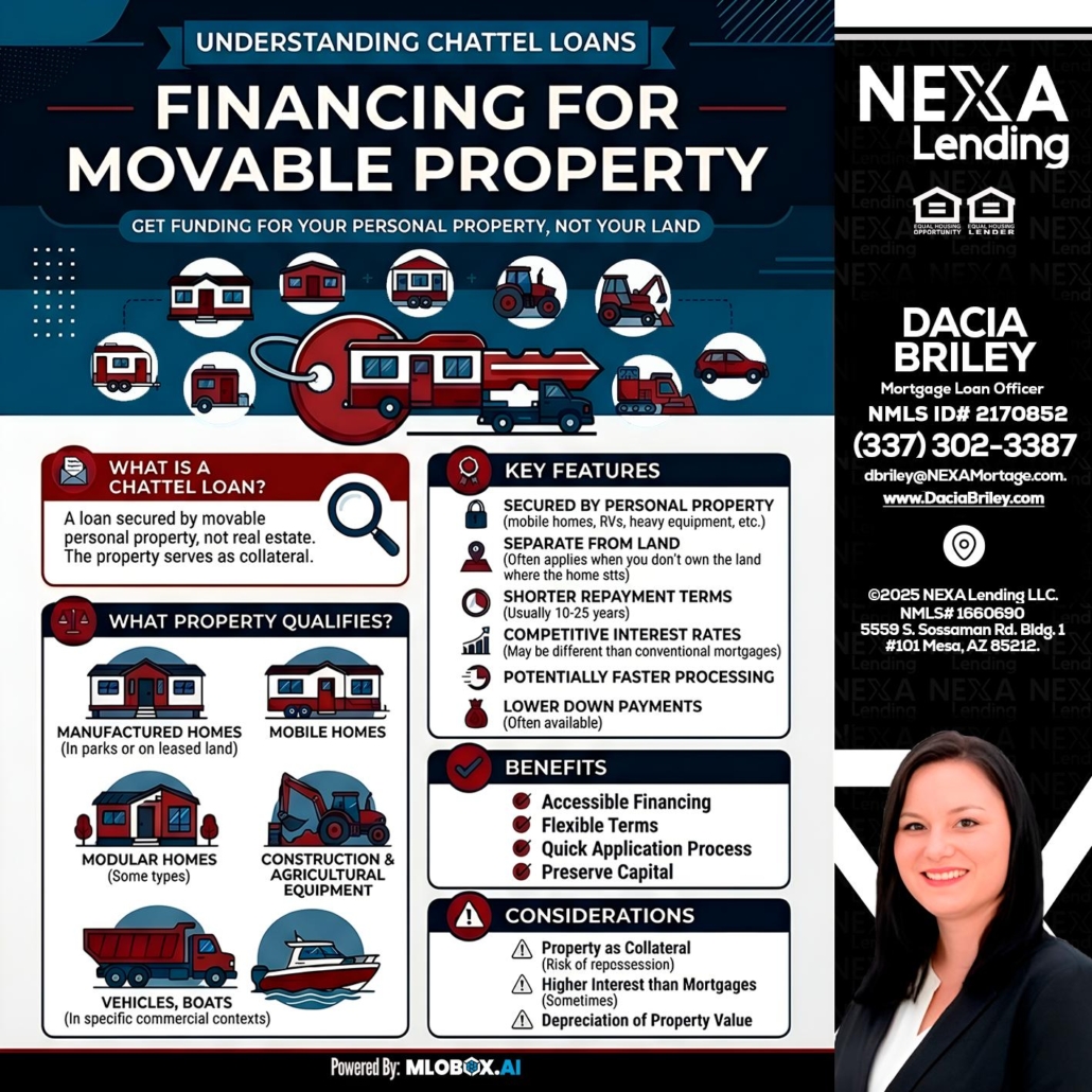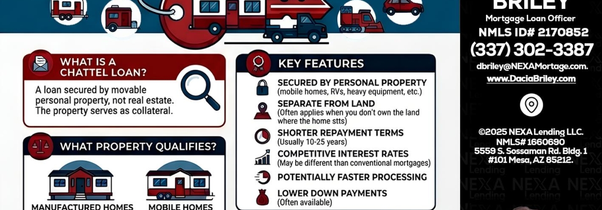 Chattel Loans - Dacia Briley -Mortgage Loan OriginatorHi, my name is Dacia Briley. I’m a Loan Officer offering personalized mortgage solutions, fast customized quotes, great rates and service with integrity. If you’re interested in learning more about the Chattel loan or any other, just let me know and I’ll walk you through your options.