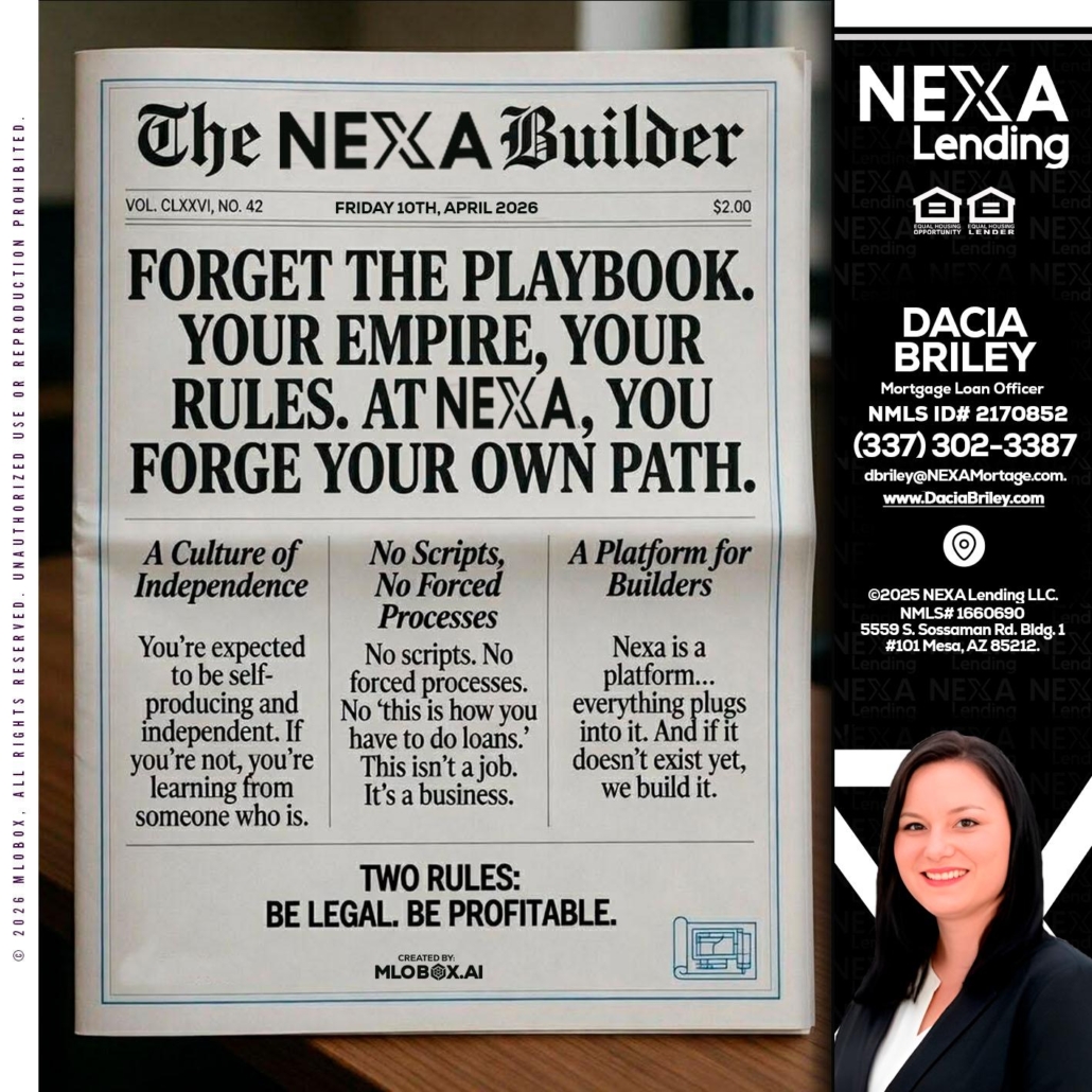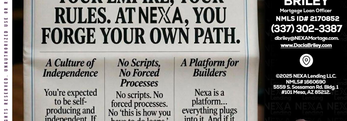 Hi, my name is Dacia Briley. I’m a Loan Officer with NEXA Lending LLC., offering personalized mortgage solutions, fast customized quotes, great rates and service with integrity.